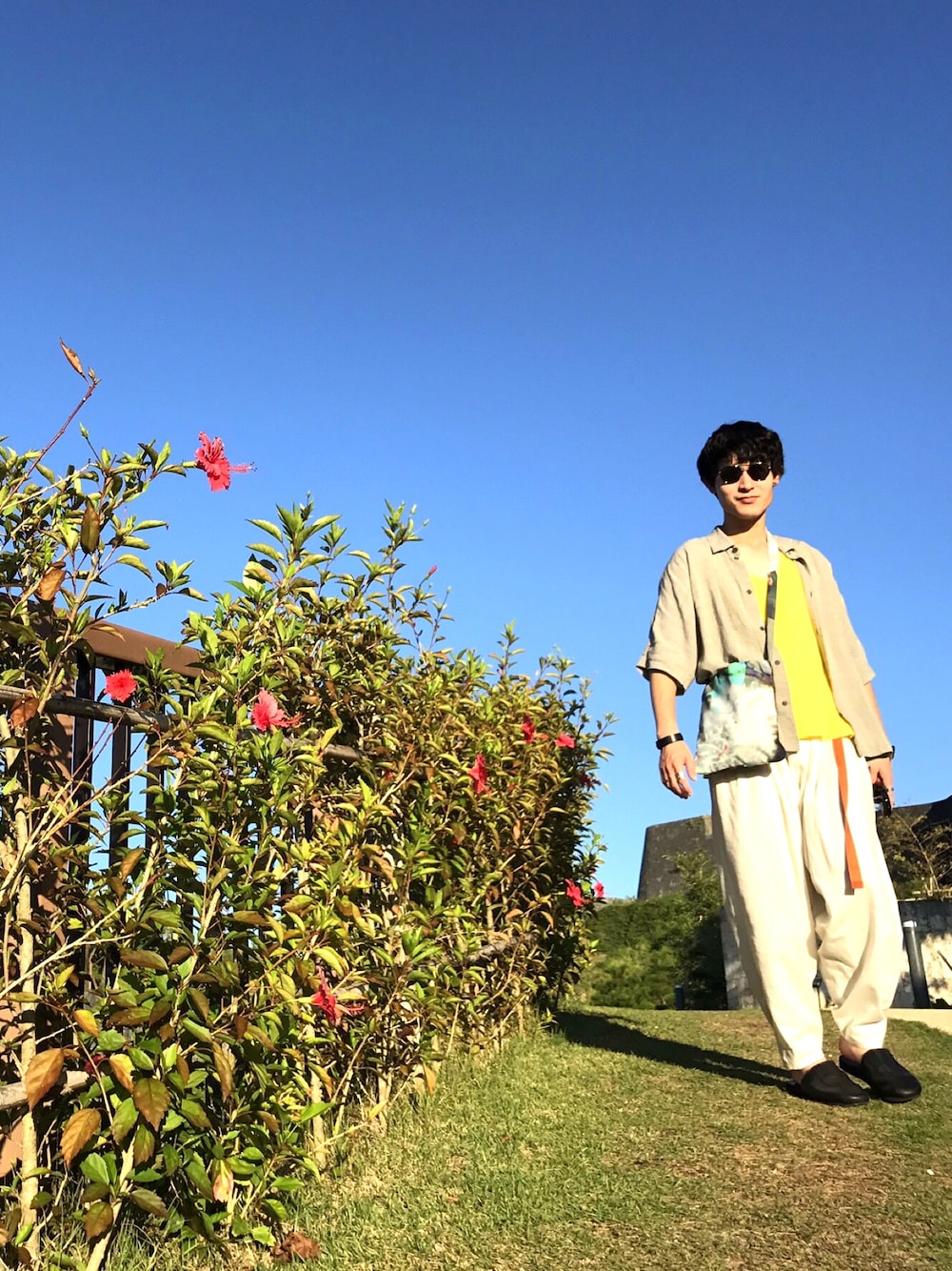 沖縄に来てます。 私のなつやすみ。2017。 首里城の、裏庭?みたいなところで、 ハイビスカスと、わたしと、青空。 沖縄、晴れて良かったです。 BGMは、私の地元出身のバンド omoinotake。 最近はこのバンドにどハマりしてます。⇦松江水郷祭にて、フリーライブ観賞してからです。