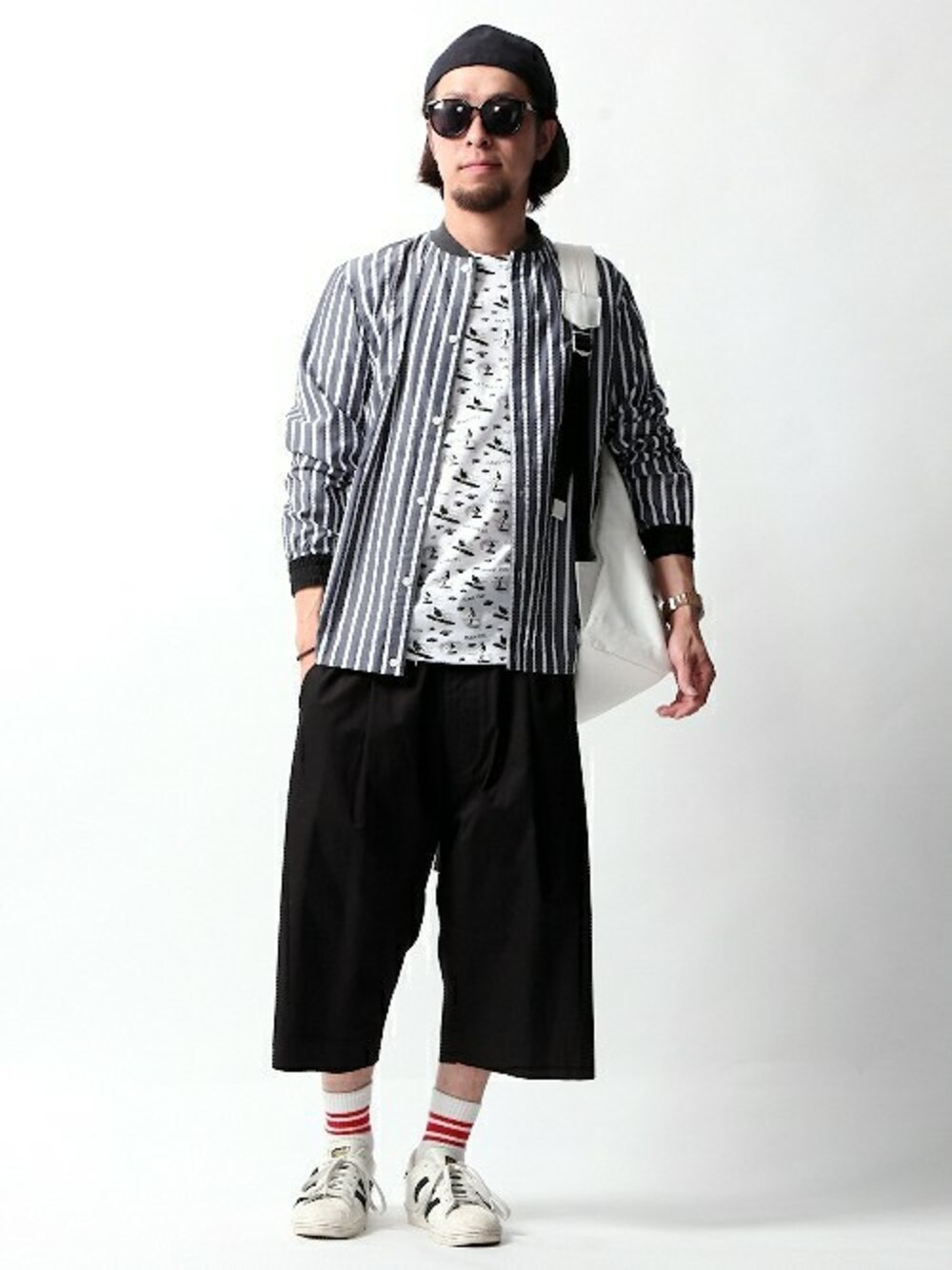 夏を意識したコーディネート。ABAHOUSEのシャツブルゾンはこれかの時期には最適! 話題のadidas SUPERSTARにガウチョパンツをあわせラインソックスをみせたトレンドコーディネート。 インナーはCUISSE DE GRENOUILLEの総柄Tシャツです。