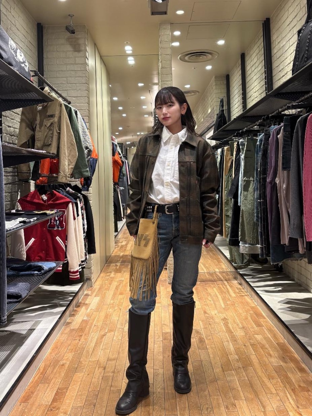 お問い合わせはinstagram @smk_40 まで🐎🤠 新作&RESTOCKのアイテムを使ってカウガール風に✨ バッグ以外メンズアイテムですがレディースが着てももちろん可愛いです💕💕 styling by RINA @YOKOHAMA JOINUS 身長160cm ジャケット Lサイズ シャツ Mサイズ デニムパンツ 28inch
