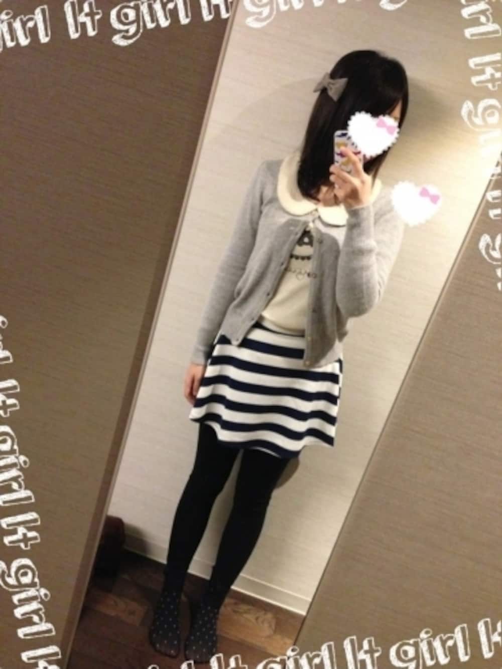 バレンタイン風 なんかバレンタインぽくないですか?(^O^) スカートは紺のボーダーで、 Forever21ですっごく安かったのに 可愛くてお気に入り♡
