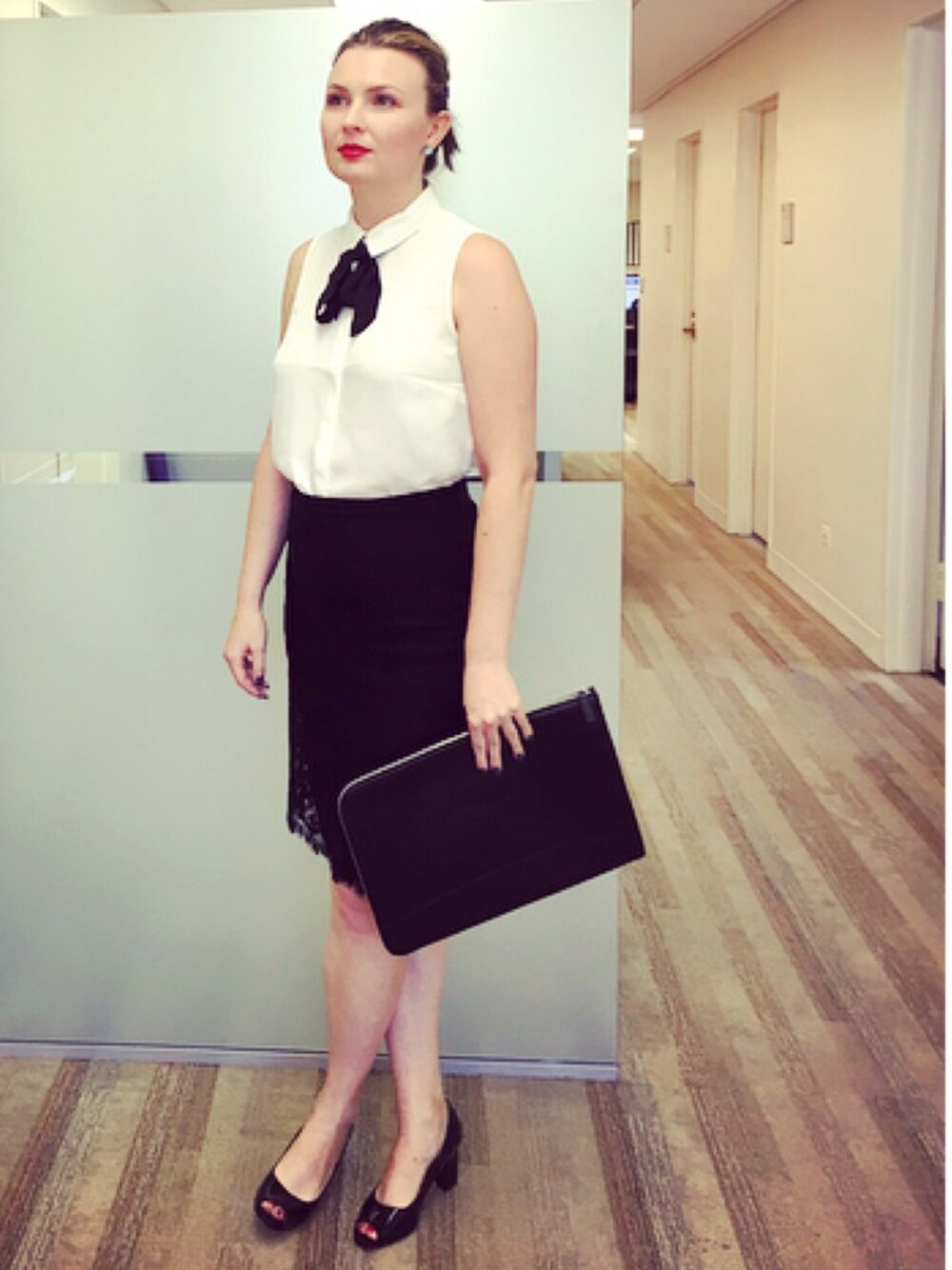 New H&M blouse from the sale section tucked into dvf skirt, carrying a leather portfolio. Red lip.