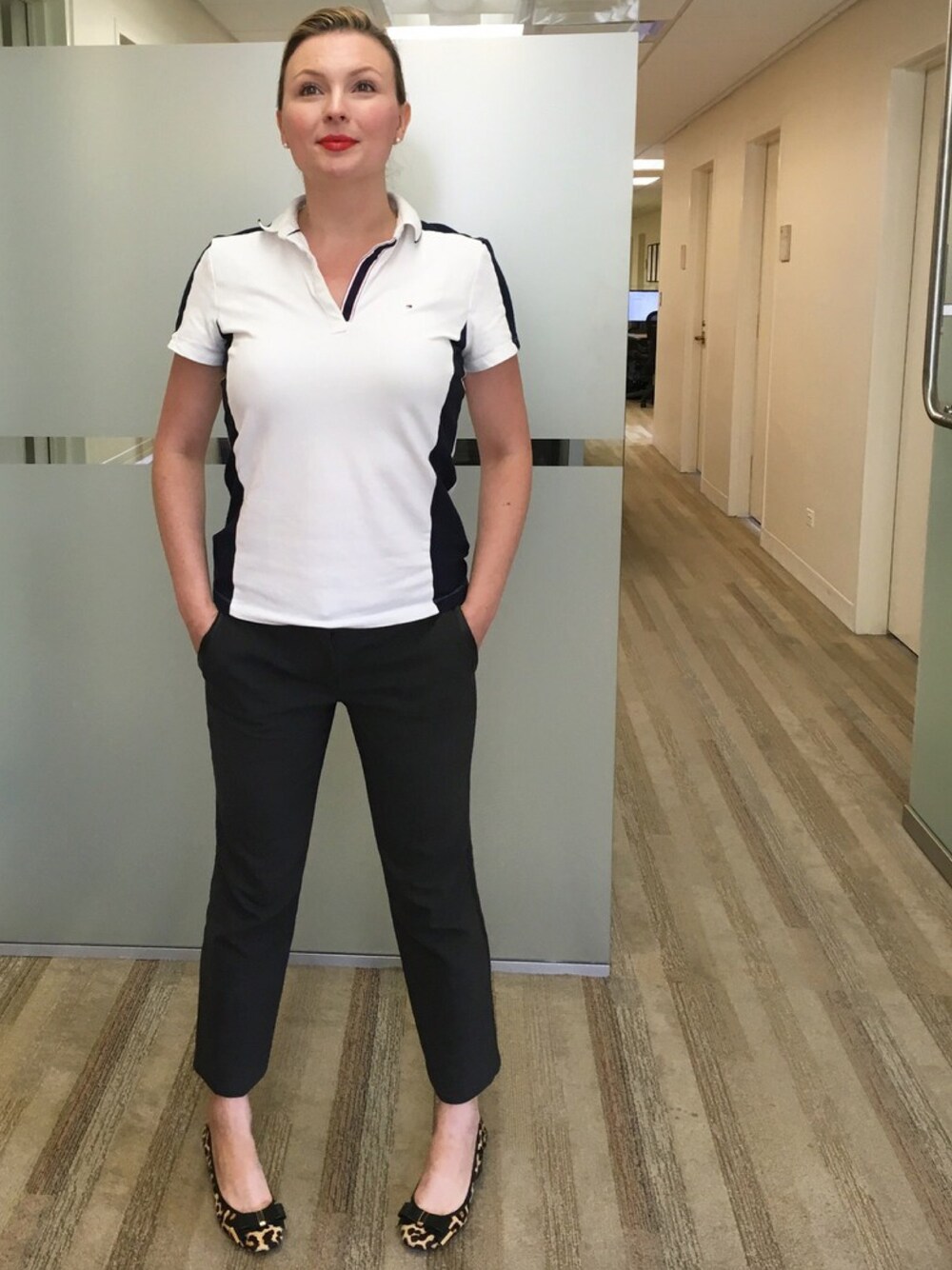 Preppy polo with grey work pants. Leopard block heel shoes and an orange lip. An easy look.