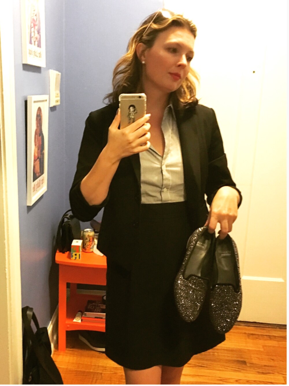 A little shine, studded slipper loafers with black and white suiting, mirror aviators.