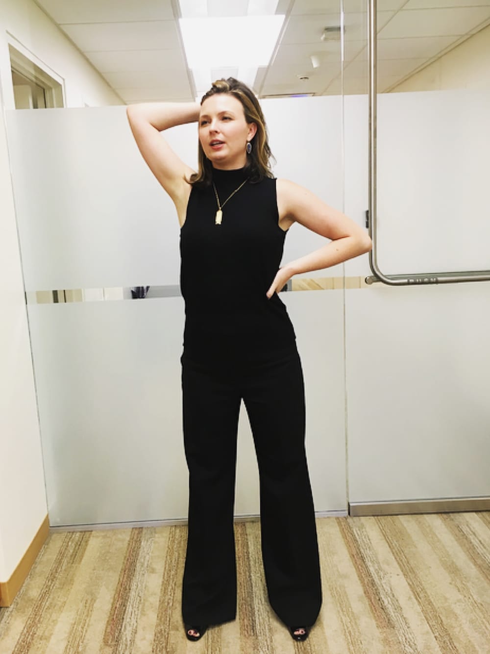 Simple dressing. Black ripped sleeveless turtleneck and wide leg black trousers. Sleek and chic.