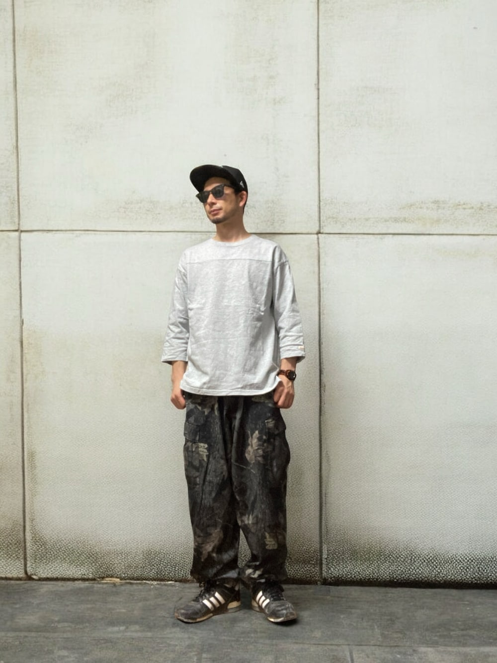 七分袖フットボールTにカーゴパンツ 脱ぎ着しないなら七分袖が丁度いい気温です 3枚目は某陸上選手もやっていたネテロ会長のポーズ(小窓) ご覧いただきありがとうございます 心より感謝申し上げます