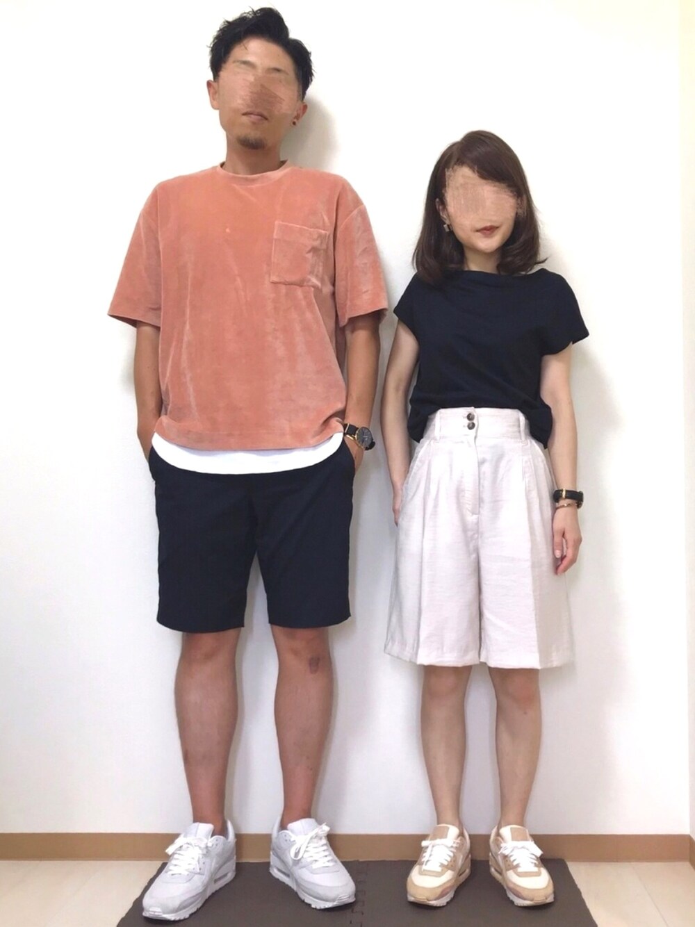 🧥着回しコーディネート👖 🙋♂️*🙋♀️ ver. -リンク- ・全体のカラー合わせ ベージュ(ピンク•オレンジ)*ホワイト*ブラック ・スニーカー👟AIR MAX 90 ・腕時計⌚️ ・ハーフパンツ🩳 🙋♂️173cm 🙋♀️148cm