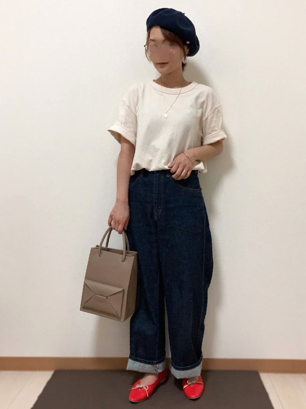 👚着回しコーディネート👖 ベレー帽×メガネ ゆるらくコーディネート Tシャツ:UNIQLO