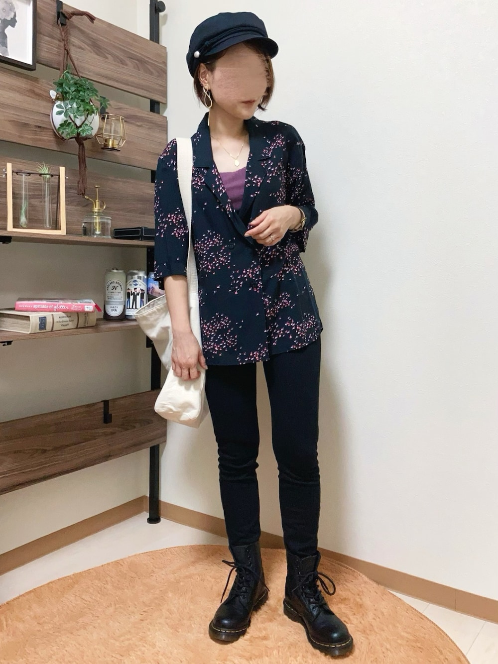 👖着回しコーディネート🥾 足の先まで ブラックコーディネート◆〃 これまた新鮮な感じ˚✧₊⁎ さりげない🦩柄が可愛いやつ〜