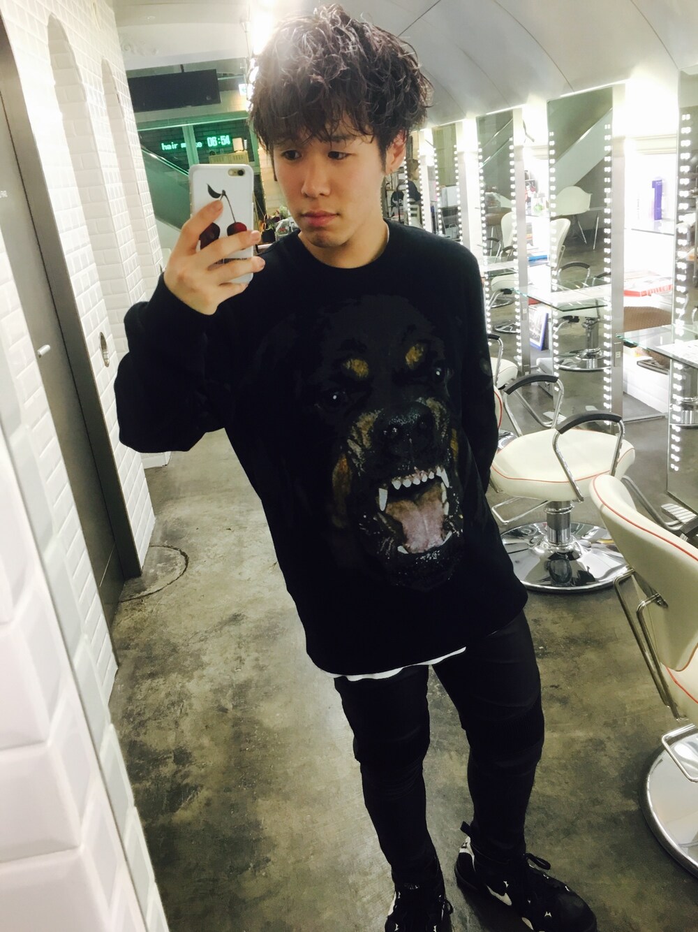 GIVENCHYのロットワイラーのスウェット これがすごいお気に入りです パンツはZARAのフェイクレザー でNIKE AIR MAX STRONG 2 オールブラックコーデ