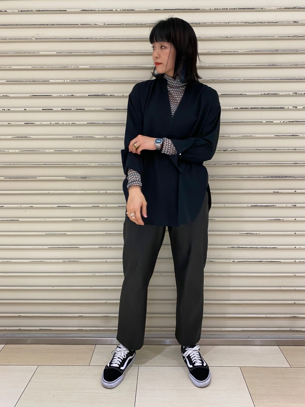 黒でまとめたモノトーンコーデです ・ 今年ジーナシスでも人気な ジオメガラをインナーとして取り入れることで 黒でまとめても重たくならないようにコーディネートしました◎ ・ 異素材のものでワントーンコーデを作るのは今年らしいスタイリングです♫