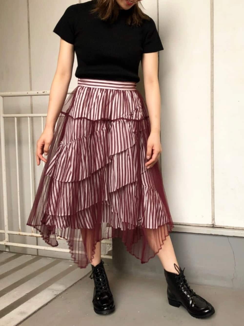 ボリューミーなティアードスカートに、ランダムヘムのチュールを重ねたトレンドの一枚。コンパクトなニットあわせや、旬なスタイリングにオススメ。