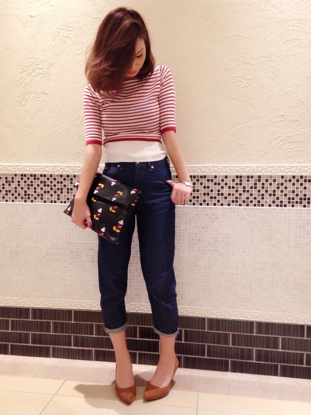 ボーイズパンツには華奢なパンプスを合わせて女性らしさは忘れずに☆ ミッキーをワンポイントに。
