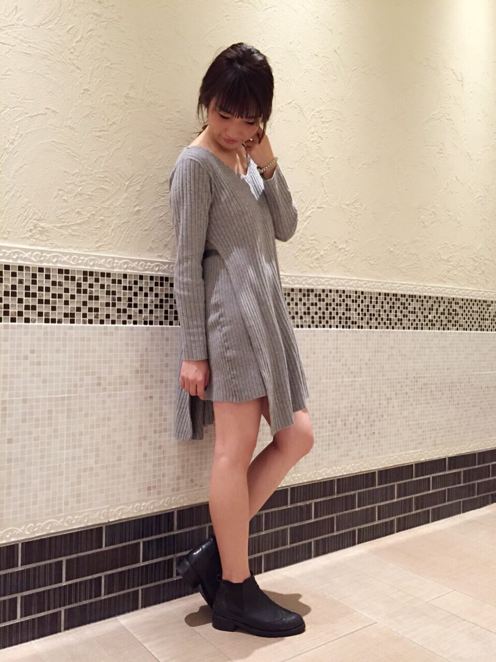 グレー系のトップス、グレー系のスカートを着用したレディースの秋コーディネートの1枚目の写真