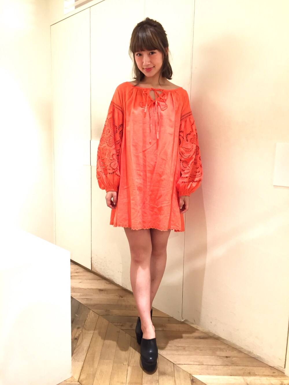 manami uchidaのワンピース/ドレス「スリーブ刺繍ワンピース」を使ったコーディネート