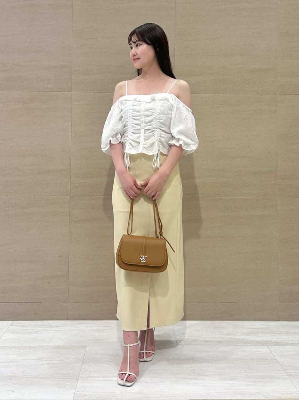 キレイめカジュアルコーデにしました🫧 ブラウスの袖は2wayで、肩に乗せてもオフショルにしても着用が可能です♡ スカートは、シンプルなデザインで、どんなシーンでも使いやすく、着回し力が豊富です♩ 身長:155cm 店舗名:博多阪急店店