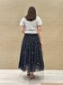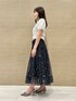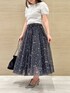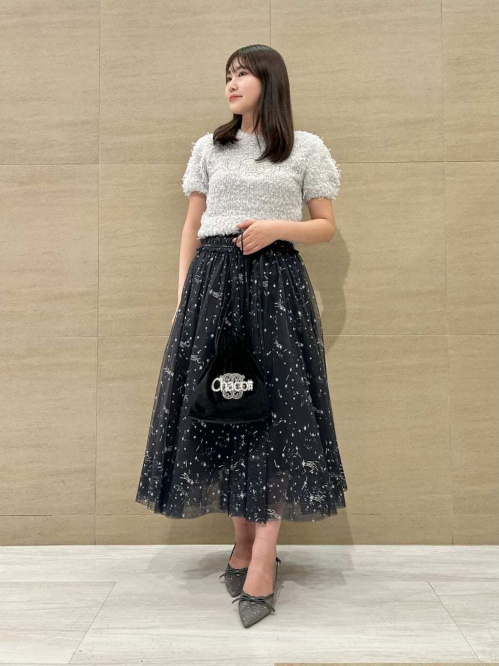Chacottコラボ第2弾🩰♡ トップスは、パールビーズで模ったダブルネーム刺繍がポイントで可愛いです🫧 スカートは、キラキラと輝くグリッターで星や流れ星をイメージしたプリントです💫 ハイウエストなデザインが、美脚効果も抜群なスカートです!♡ 身長:155cm 店舗名:博多阪急店店