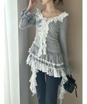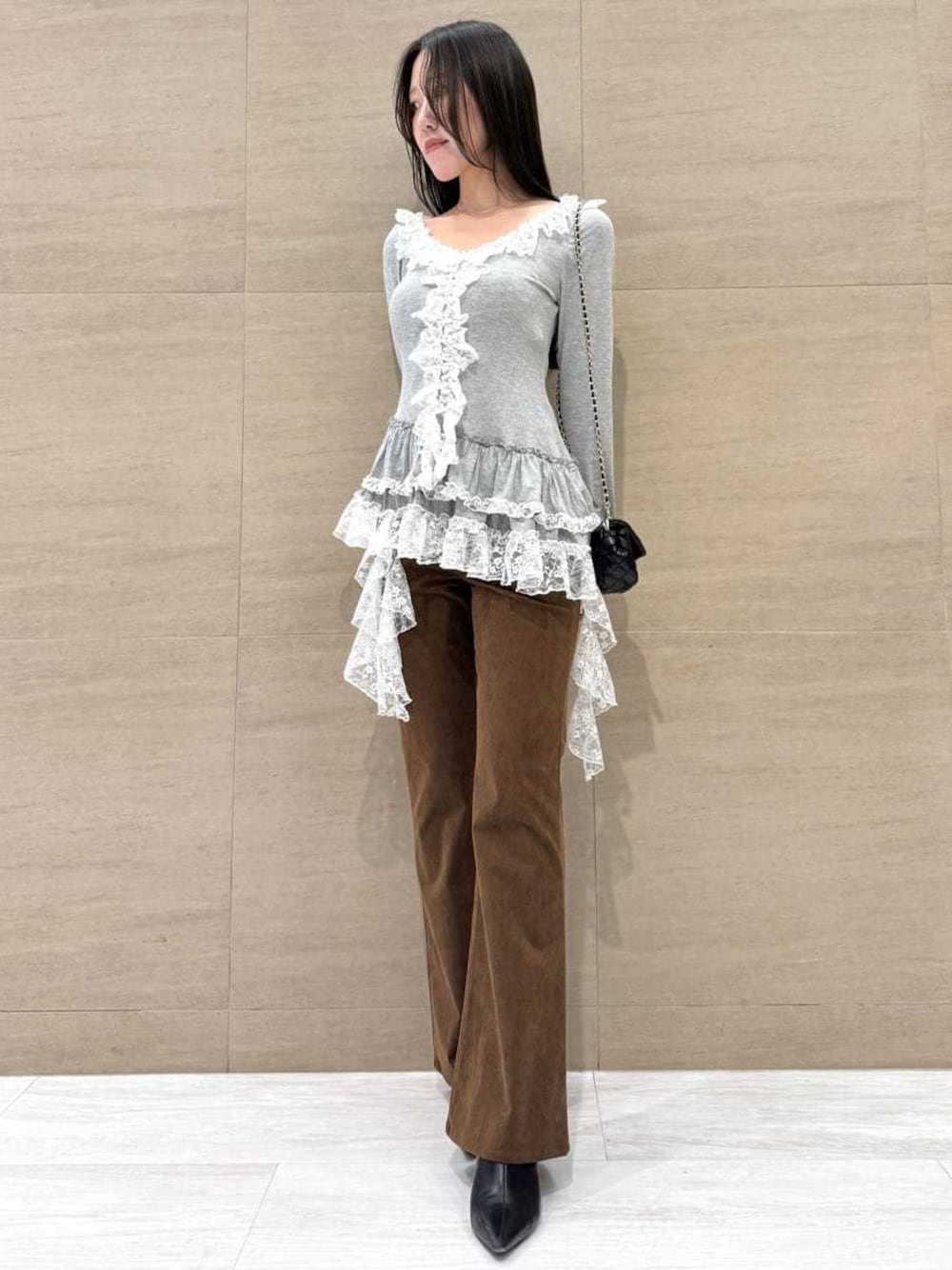 トップスはカットソー素材なので 肌触り滑らかで着心地◎ アウターの下に着ても着膨れせず、レースがちらっと見えるのもかわいいポイントです🪄 着映えするトップスなので、冬のコーデに華やかさをプラスできるアイテムです♡ 身長:166cm 店舗名:博多阪急店店