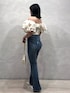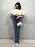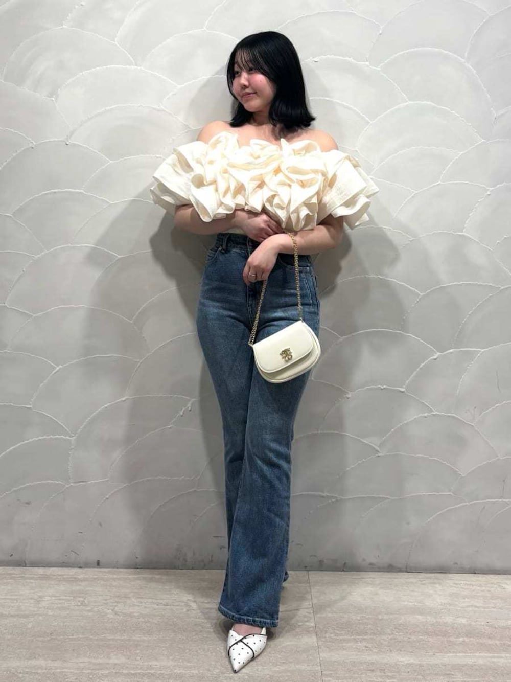 フリルたっぷりのカジュアルコーデ🎀 オフショルデザインで二の腕をカバーしてくれます! 背中部分はゴムが入っているので、窮屈感なくストレスフリーです! デニムとドットのパンプスで夏らしいコーディネートにしました🫧 身長:153cm 店舗名:ルミネ横浜店店