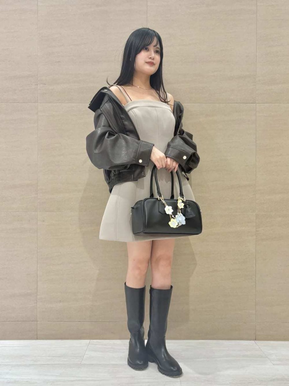 身体のラインをキレイに見せてくれる 人気のワンピースに カジュアルなジャケットを合わせました♡ ワンピースはとても肌なじみのいいカラーです♡ ジャケットはブラウンで重たすぎない コーデになるようにしました🤎 身長:158cm 店舗名:博多阪急店店
