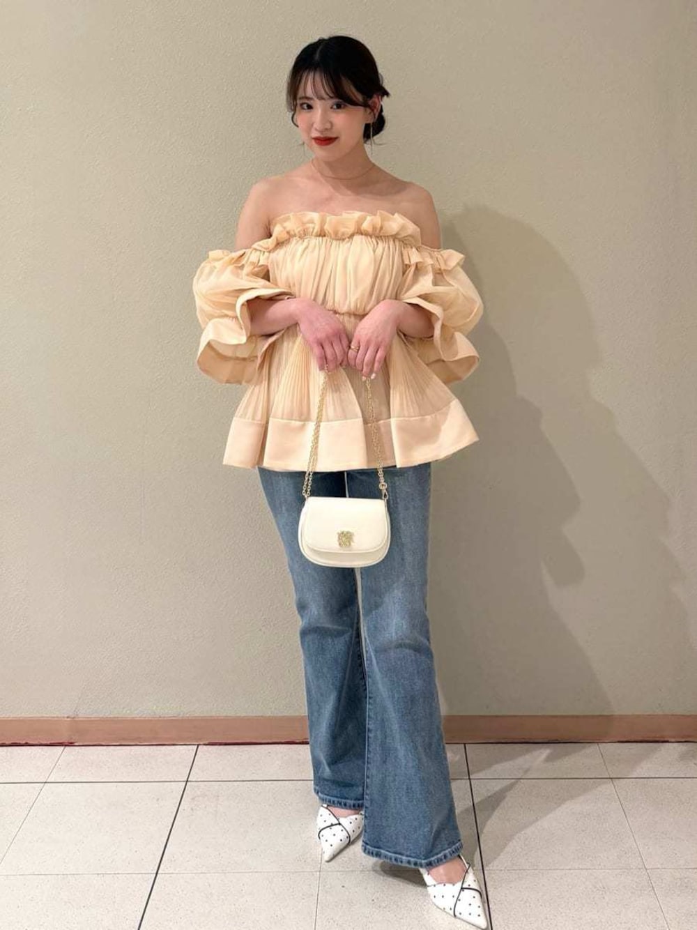 毎年人気アイテムが今季はチュニック丈で登場💓 オフショルで肌見せも可愛いし肩あげて着ても上品に着れるのが嬉しいですよね☺️🎶 身長:156cm 店舗名:熊本鶴屋店店