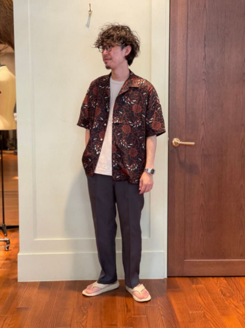 たまには柄シャツもいいですね! カラートーンを暗めにして落ち着いたオープンカラーシャツのスタイリングにしてみました! とにかくラフに合わせたいですね🔥