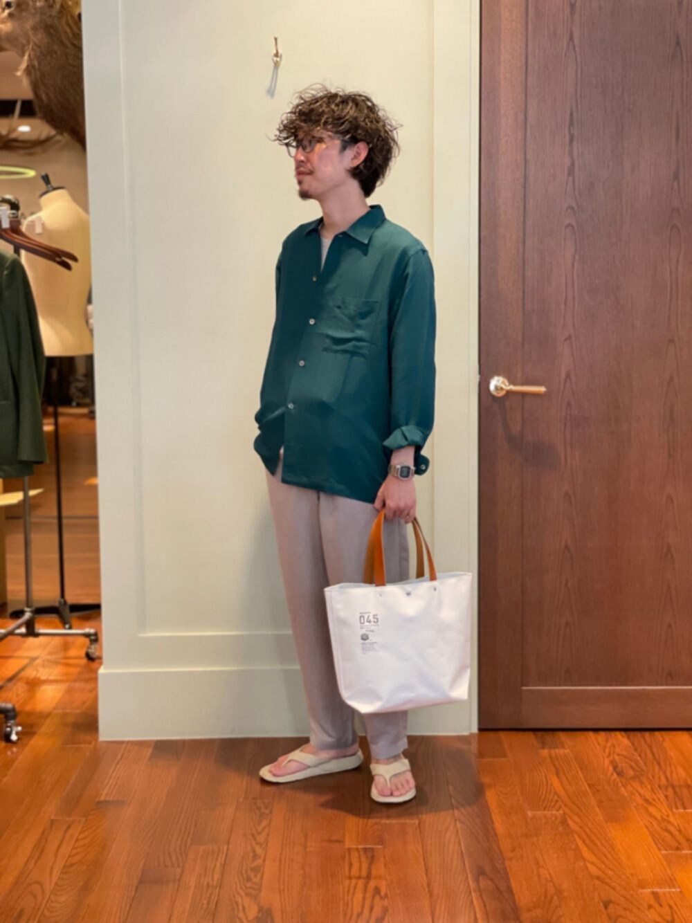 ヴィスコースリネンのボックスシャツの色味が気に入ってます! パンツもリラックス感抜群で真夏もこのまま駆け抜けていきたいですね🔥 横浜帆布シリーズのバッグも夏のスタイリングを+αしてくれるオススメバッグです!