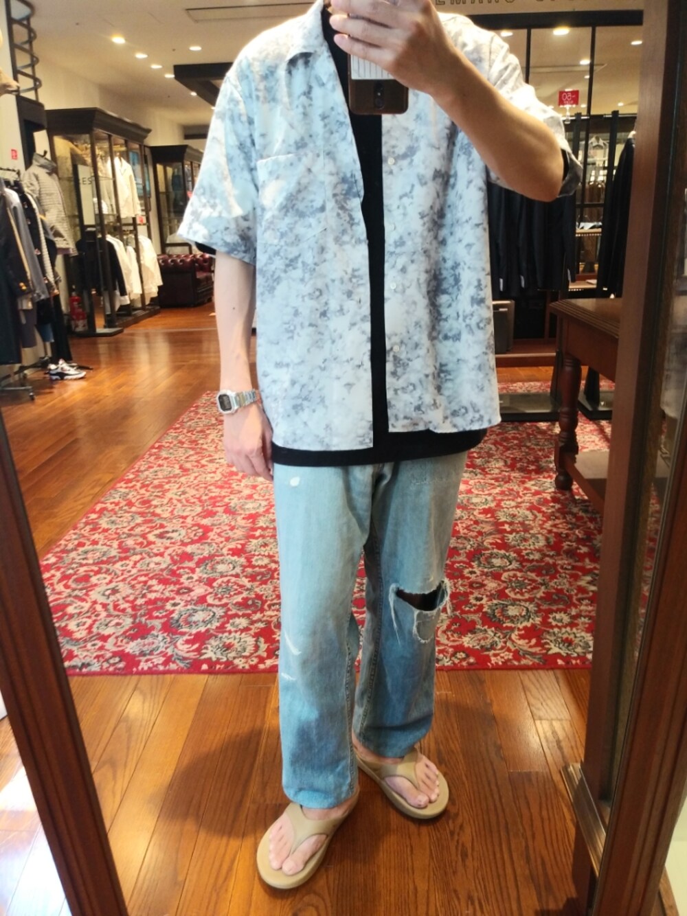 まだまだ暑いので開襟シャツは欠かせません!「スプラッシュ柄」でパンチもあっていいですね! デニムは数年前に購入したハバノスのデニムです。何年経ってもいいものはずっと着れますね🔥