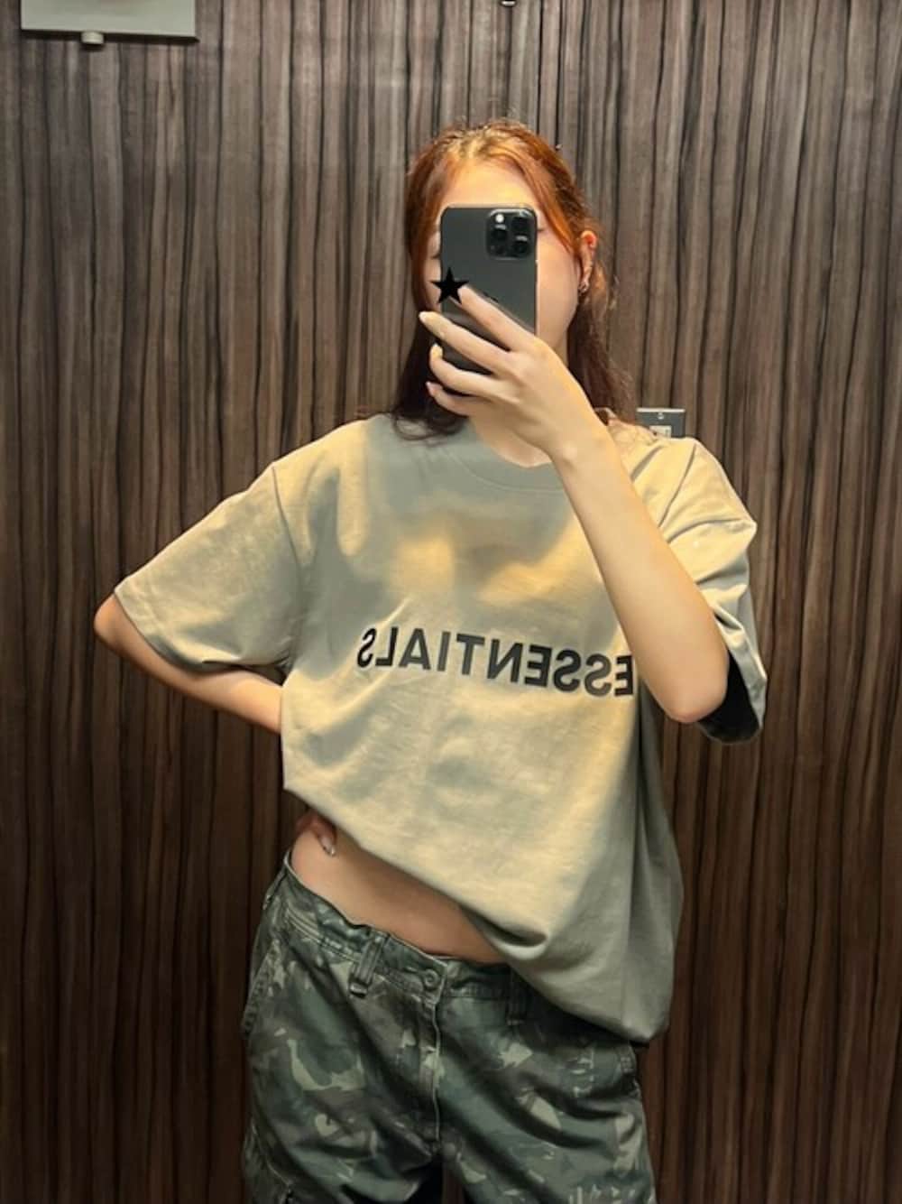ESSENTIALSのロゴTEEにカモ柄のパンツを合わせるのが可愛い😁💚