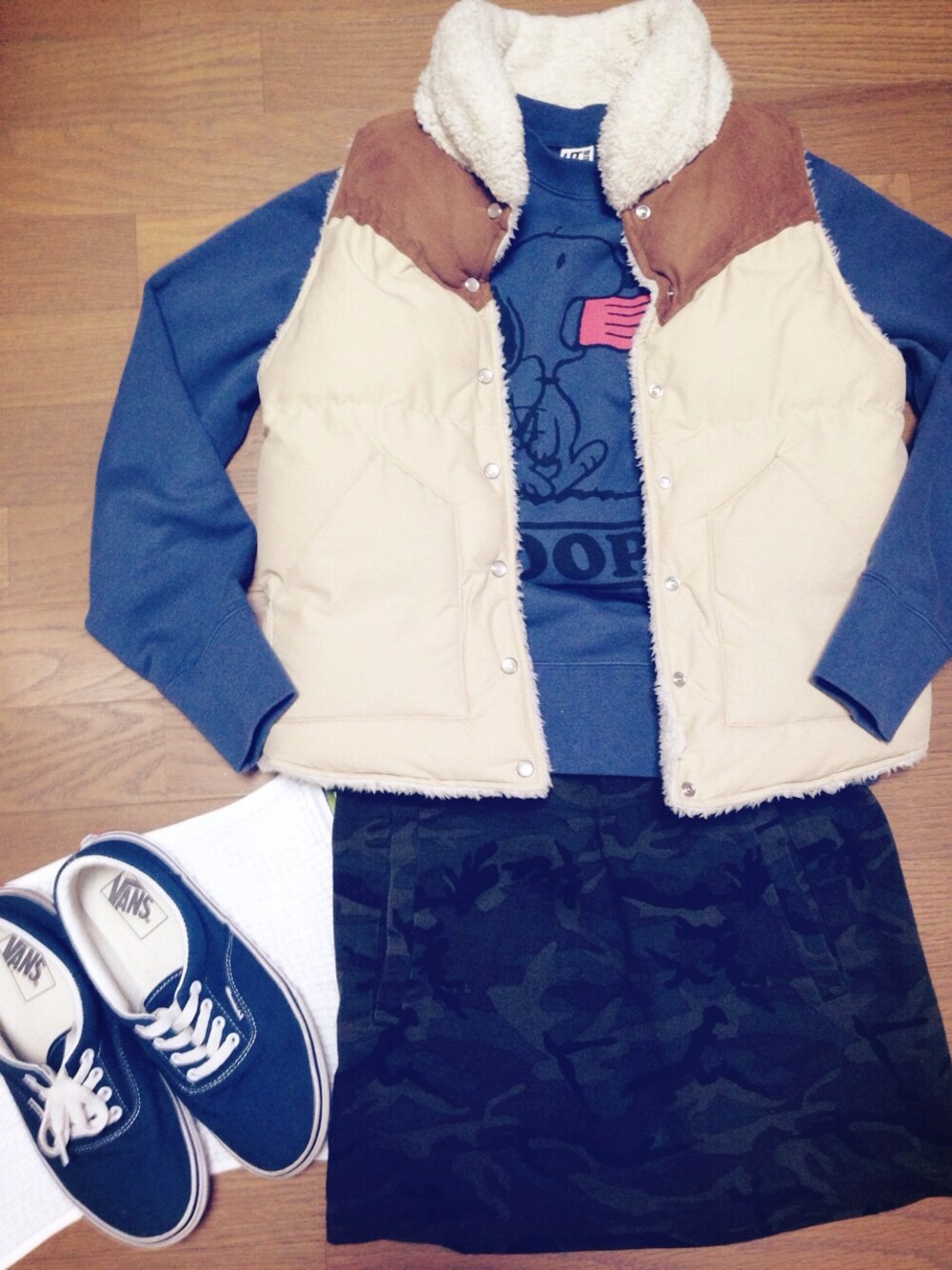 トレーナー○UNIQLO ダウンベスト○ブランド不明 スニーカー○VANS ストリートがよくわかりません…。スヌーピー大好き。