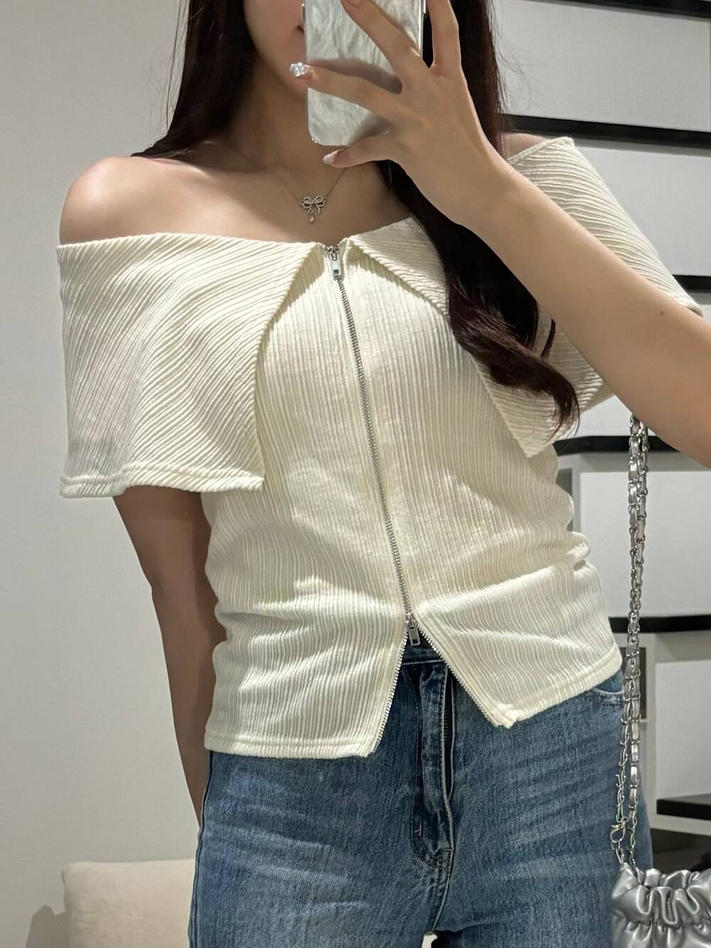 〈オフショルコーデ🤍〉 ご覧いただきありがとうございます(^^)/ ◾︎トップス ダブルジップになっていて、 オフショル着たいけど動いたら上がってくるのが嫌..って人にオススメです!!✨️ エリが大きめなので、二の腕隠したい人にオススメしたいアイテムです◎ ---------------------------------------------- ぜひ気に入ったスタイリングがあれば♡マークのお気に入りお願いします😌 Instagram▶︎【】