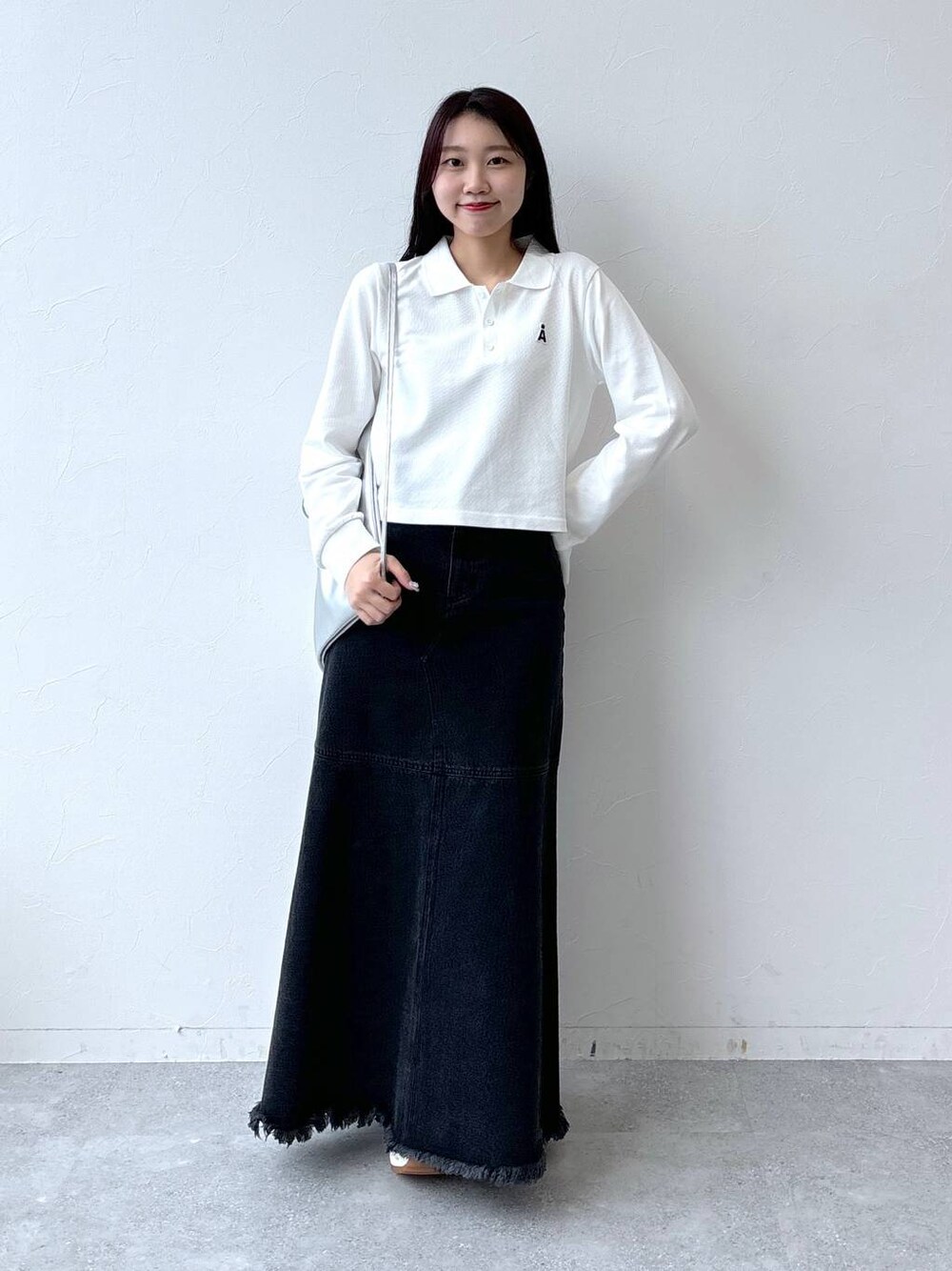 snowae(ALAND 本部)のデニムスカート「3.3 Field Trip/フリンジデニムロングスカート」を使ったコーディネート