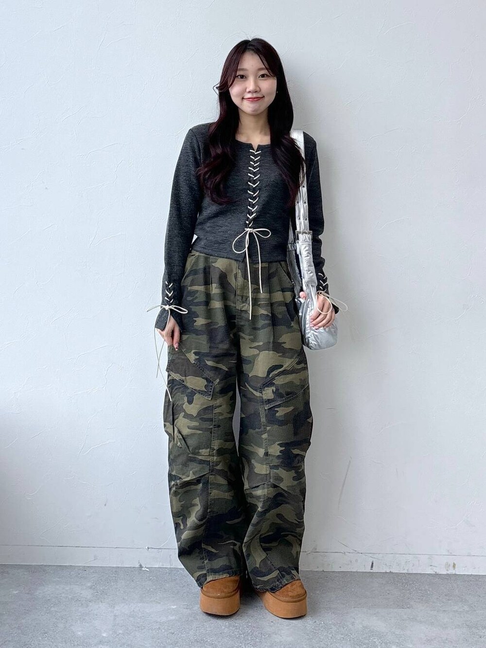 〈韓国カジュアルコーデ🍀〉 ご覧いただきありがとうございます(^^)/ ◾︎トップス リボンの紐がたくさん付いたカジュアルトップスです! 迷彩柄のボトムスと合わせて韓国ストリート風に着てみました💫 リボンの紐はスウェードになっているので、今年流行りのウエスタン要素も入ってます☝🏻 ---------------------------------------------- ぜひ気に入ったスタイリングがあれば♡マークのお気に入りお願いします😌 Instagram▶︎【】
