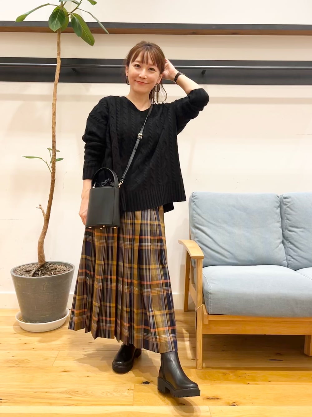 「チェックのスカート、可愛いと思うけど ええ歳やのに妙スクール感出たら嫌やなぁ…」と私と同じお悩みの方も多いのではないでしょうか。 何となくキッチリ感のあるものを合わせるとよりスクール感が出ると思うので ハミルトンウールアラン柄プルオーバー、だいぶおすすめです。(^^) ちょっとゆるっと抜け感ある女性らしいシルエットと開きすぎず詰まりすぎず使いやすいスッキリVネックがちゃんとスクールから卒業させてくれます♡ トラックソールサイドゴアブーツのソールのゴツさもスカートと合わせるとグッと引き締めてくれてカッコ良くしてくれます。 履き心地もとっても楽で、ソール以外はスッキリしたシルエットなのでトレンド感はありつつも長く使っていただけると思います♪