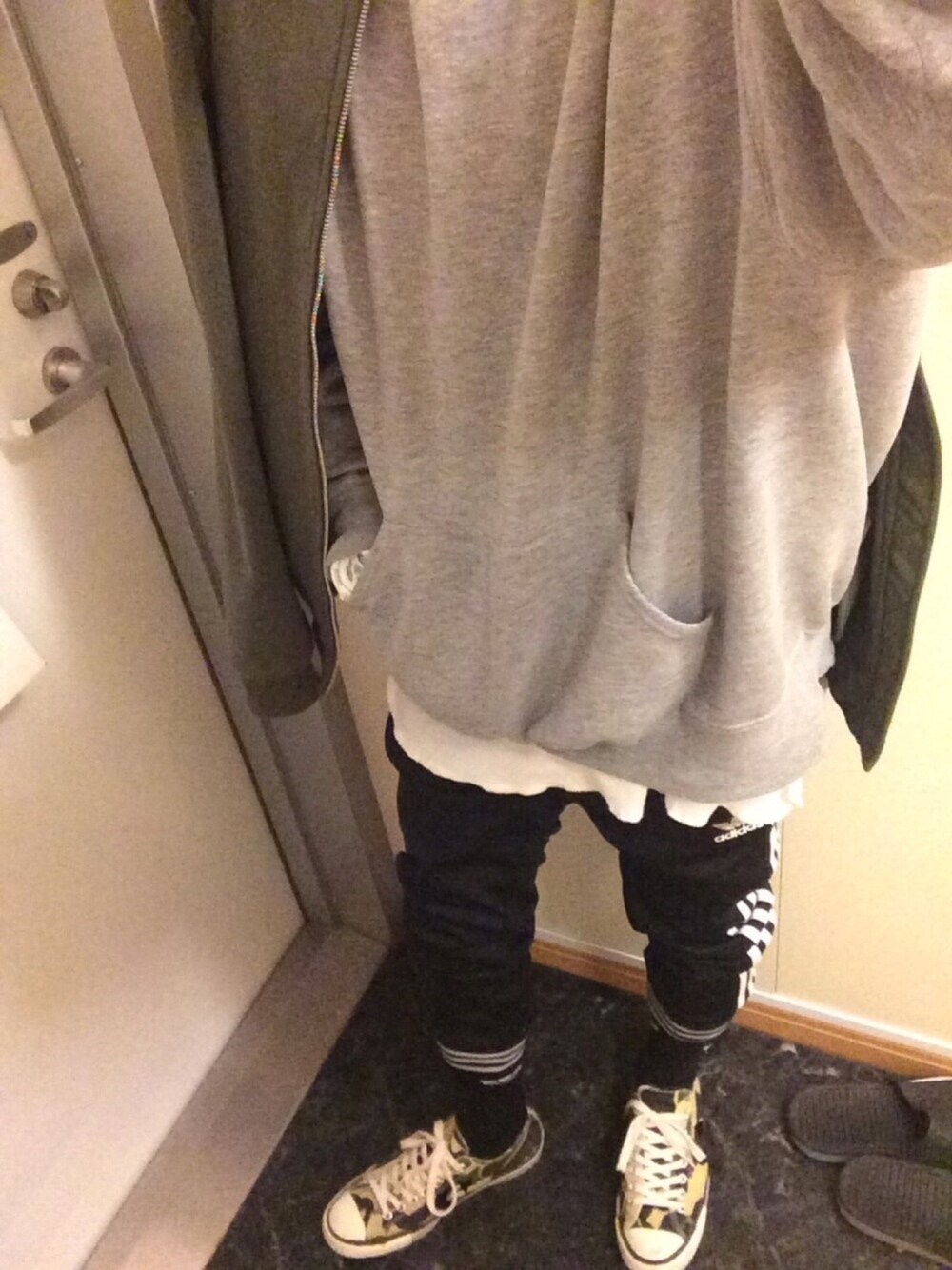 スニーカーは、CONVERSEとSTUSSYがコラボした迷彩柄のお気に入りです! adidas originalsの靴下を、パンツにかぶせて履きました! 古着のパーカーは、オーバーサイズです!