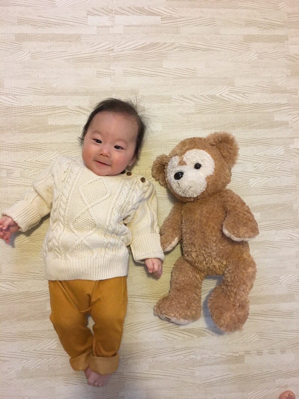 ホワイト系のニット/セーター、オレンジ系のその他パンツを着用したキッズの冬コーディネートの1枚目の写真