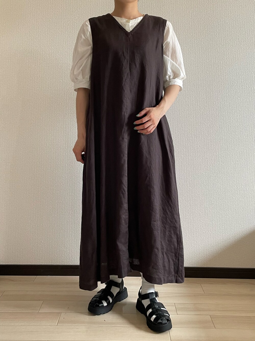 無印良品ノースリーブワンピース 一枚で着るのももちろんかわいいけど わたしはシャツとの重ね着が好み🪵 トレンドのグルカサンダルもかわいい🌻