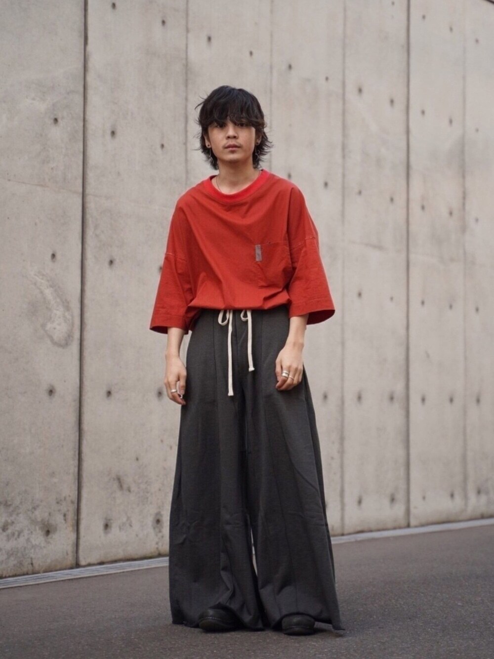 Tシャツ感覚で着られるシャツブラウスを袴のようなスウェットパンツにインして。ラフな合わせながら洗練されたコーディネートを心掛けました。 staff / Shoei
