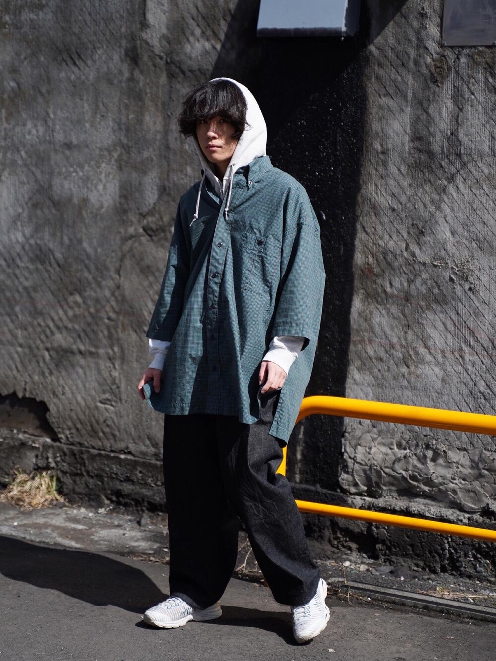 ビッグシルエットのボタンダウンシャツを古着のパーカーとレイヤードしたスケータースタイル。ゆったりとした袴パンツに足元はスニーカーで。 staff / Yudai