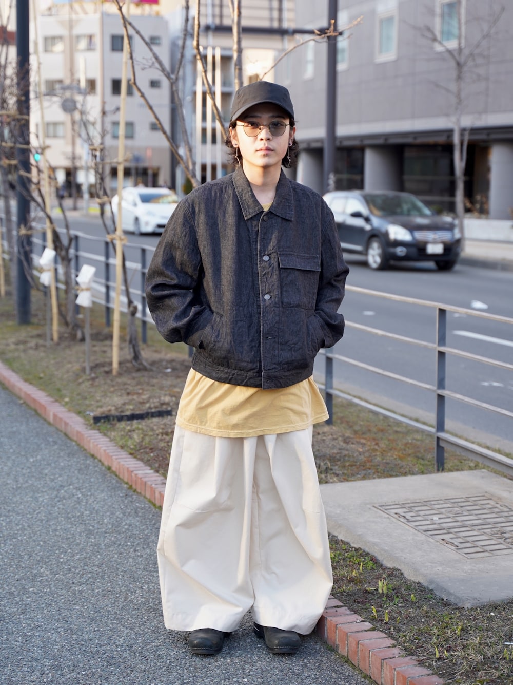 コンパクトなリネンデニムジャケットにワイドパンツを合わせてAラインのシルエットを意識してコーディネート。 staff / Shoei