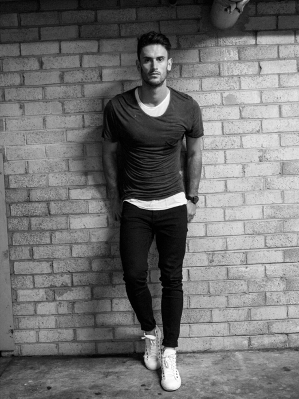 Street style in a classic plain tee teamed with a killer pair of skinny jeans, vey cool