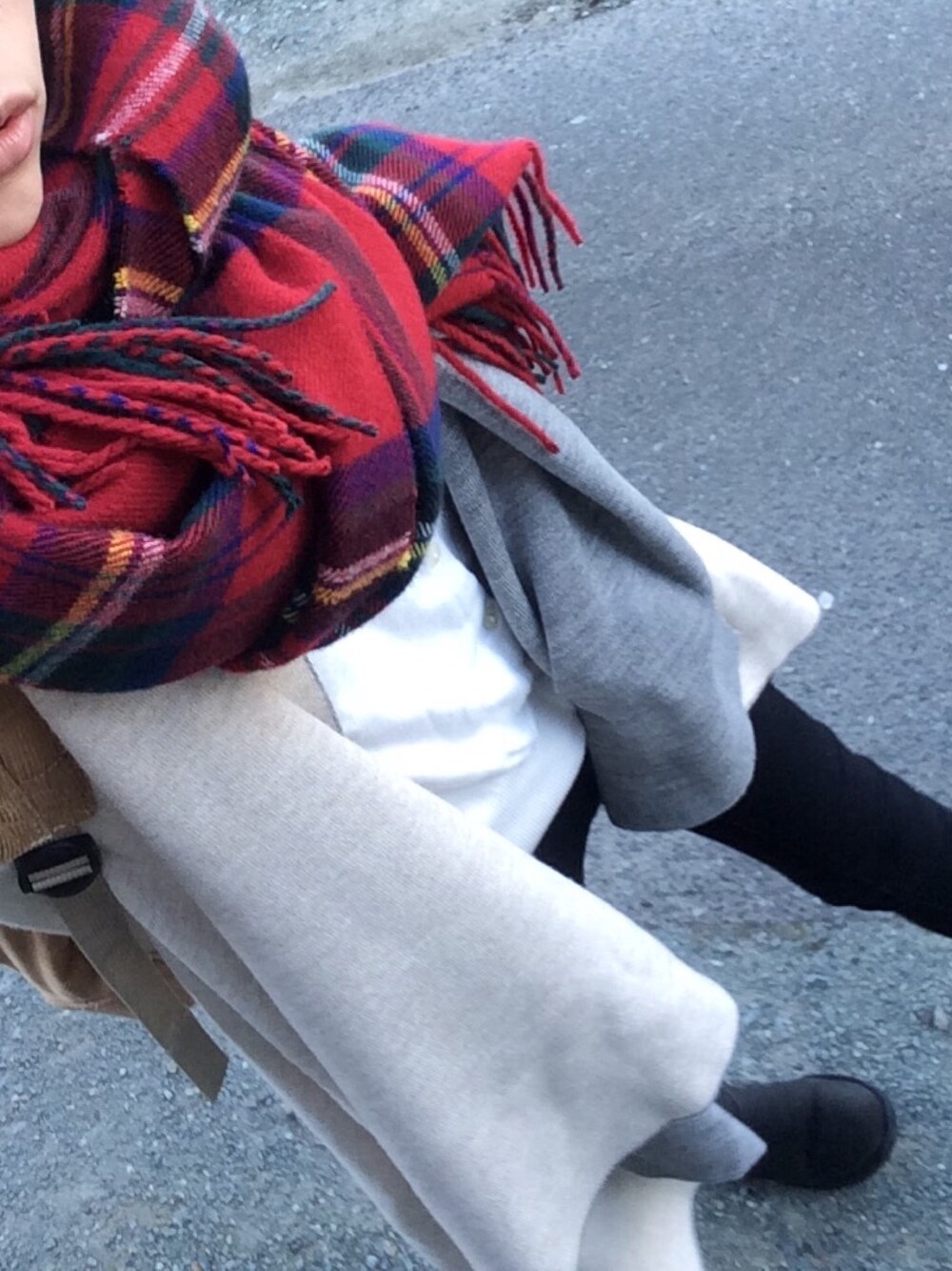 今朝は寒かった なので、大判チェックストール♡ かなりボリューム出るのでぬくぬく(^^) UNIQLOのカーディガンをボタン全部閉めてトップスとして着てアウターにはZARAのコーディガン♪*変形ニットで裏地がグレーで、ドレープ加減がたまらなく好き♡ GAPのパンツはストレッチ効いてて履きやすい〜(*´艸`*)