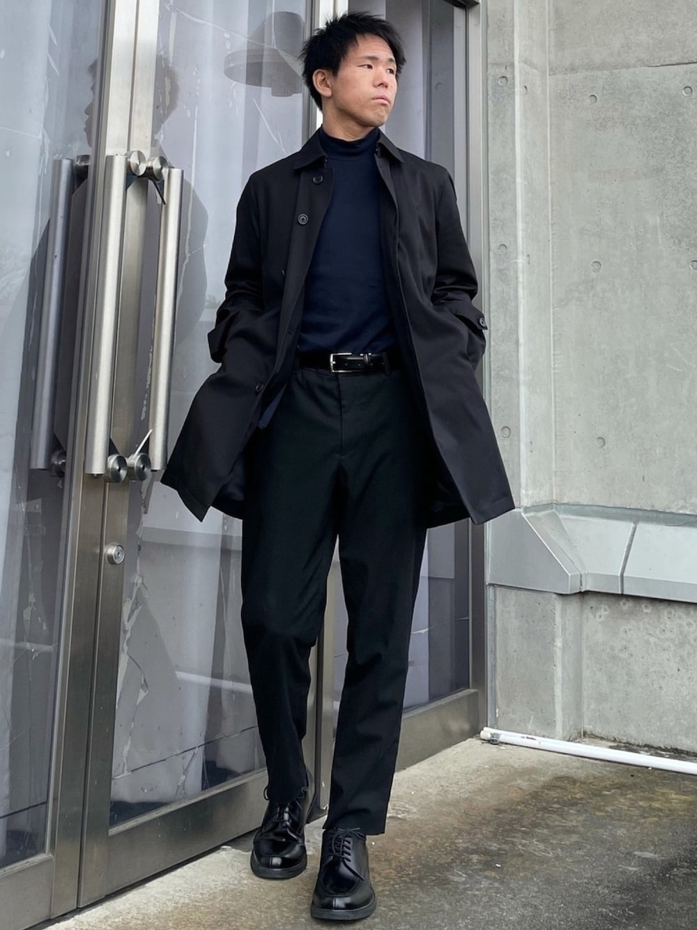 🏳️🌈 ネイビー ✖️ ブラック ✖️ ブラック 👕 タートルネック✖️ステンカラー✖️ スラックス エレガントなオールブラックコーデ タートルネックとステンカラーコートの相性は抜群 インナーにはほぼブラックなネイビー色を採用 ベルトを見せてアクセントに 他にもオールブラックなコーデを載せています 是非見に来て下さい
