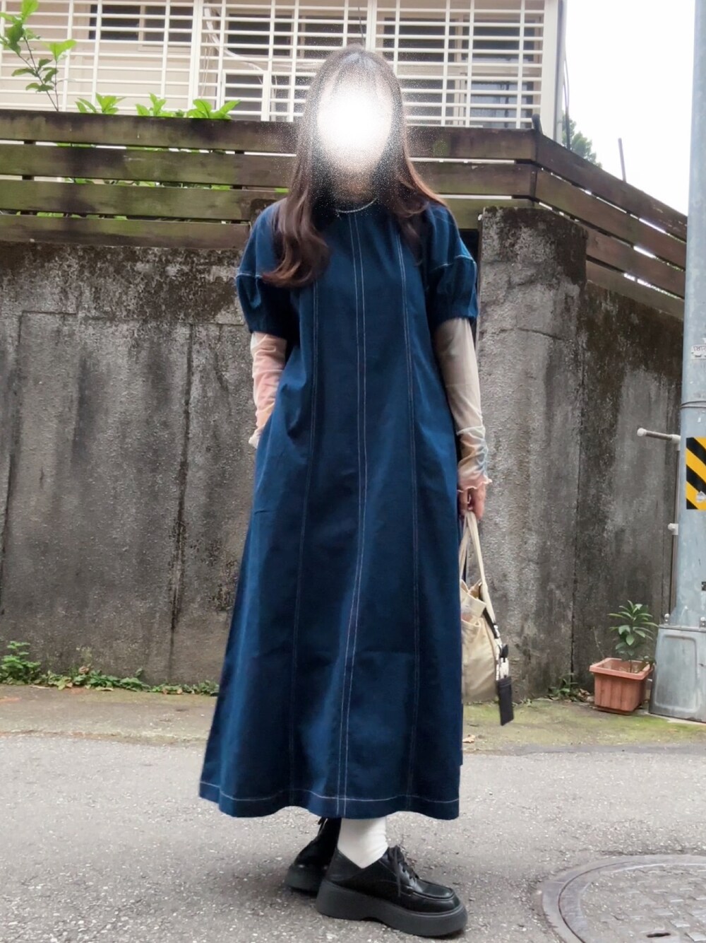 ブルー系のワンピースを着用したレディースの春コーディネートの1枚目の写真