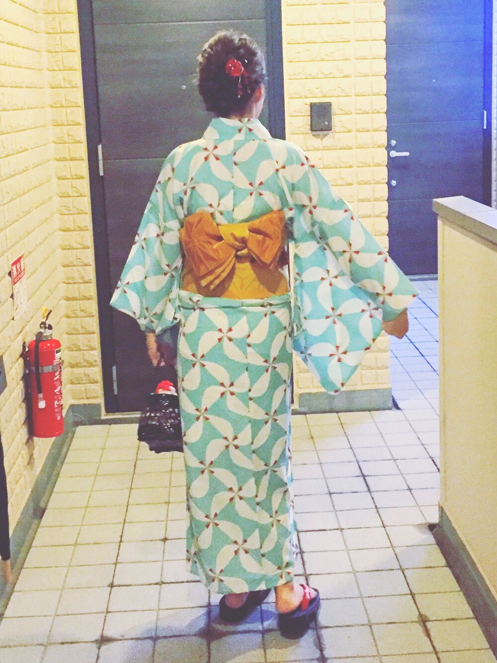 たまには置き撮りじゃない、 後ろ姿だけど👘 雑誌で一目惚れしたエメラルドグリーンの風車柄の浴衣➕黄色の帯♡