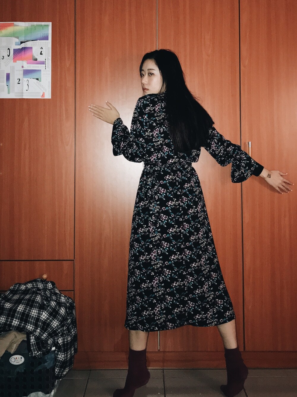 ブラック系のワンピースを着用したレディースの冬コーディネートの1枚目の写真