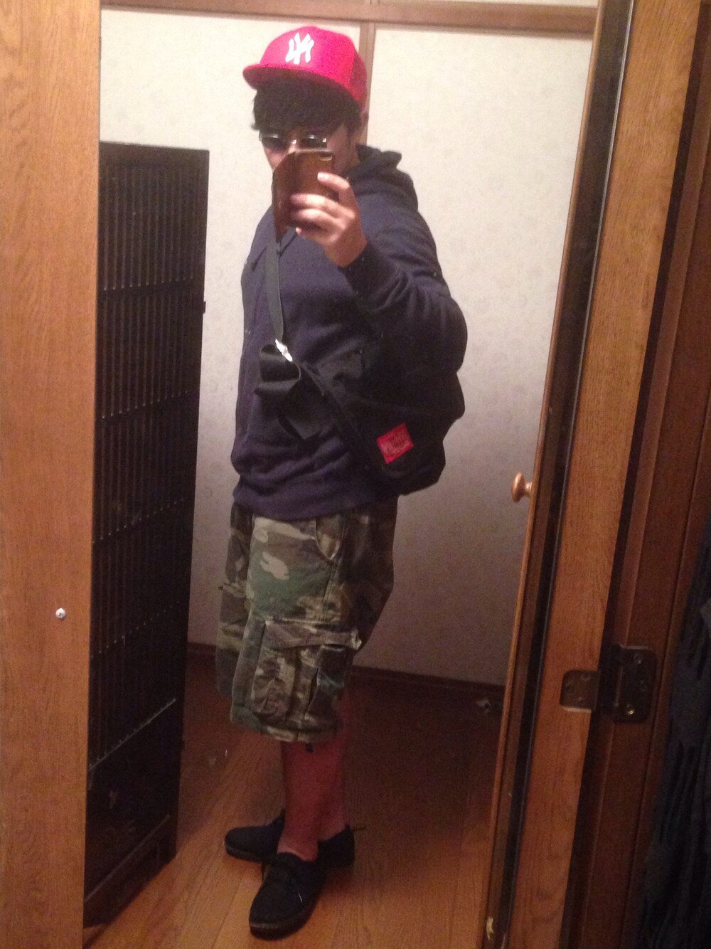 ぼうし:NewEra めがね:Ray-Ban ぱーかー:Champion かばん:Manhattan Portage ずぼん: ---- くつ:Dr.Martens