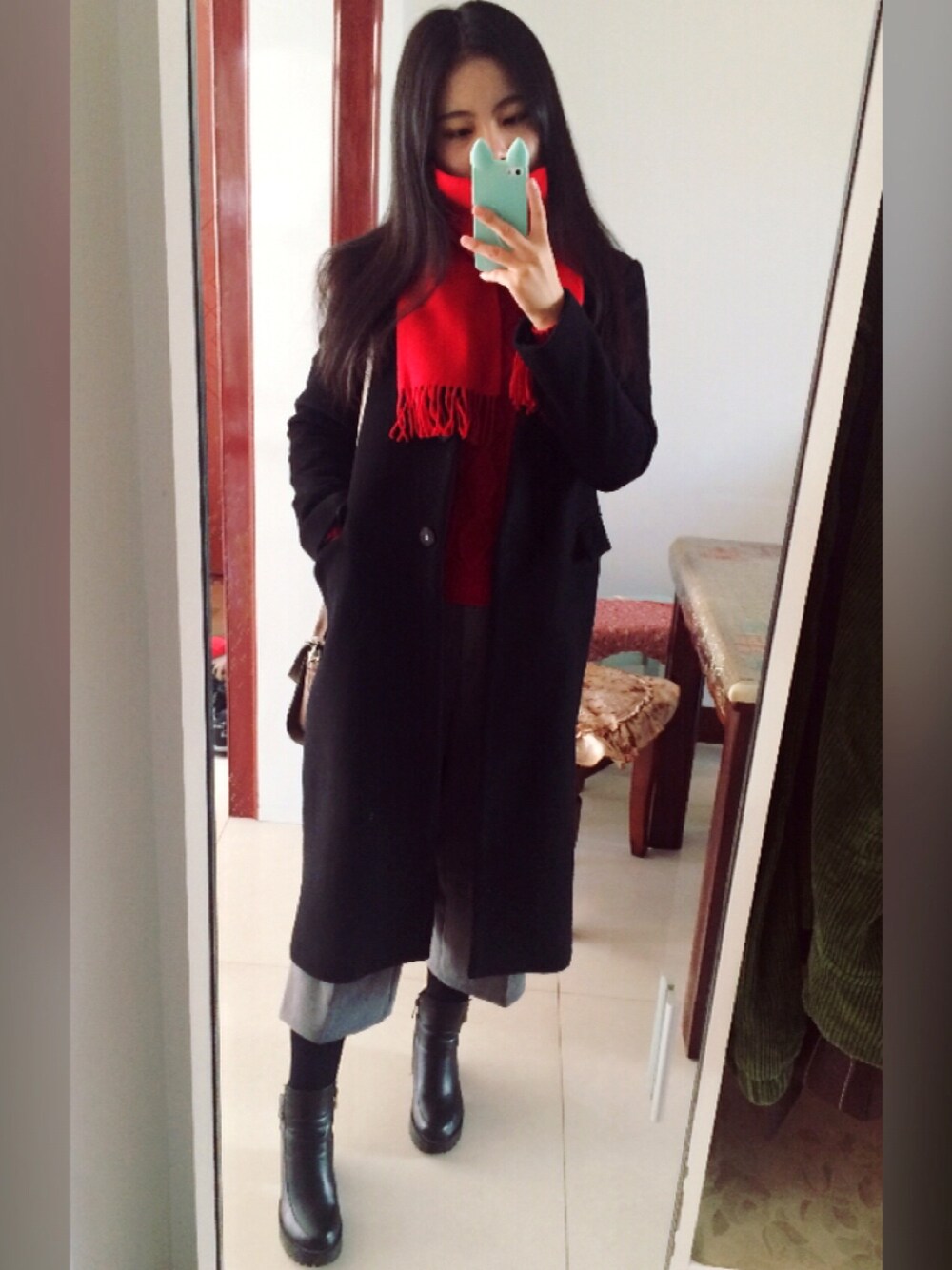 滴水成冰的北方冬日,年末归乡,和家人在一起时红色系十分讨喜。枣红色厚毛衣搭配浅灰色阔腿裤加亮内搭颜色,穿很长的黑色呢子大衣显得人很修长,大红色羊毛围巾起到点睛的作用,黑色粗跟皮鞋呼应大衣颜色,皮粉色单肩包是一个颜色不太大众的日常包,并没有刻意搭配。