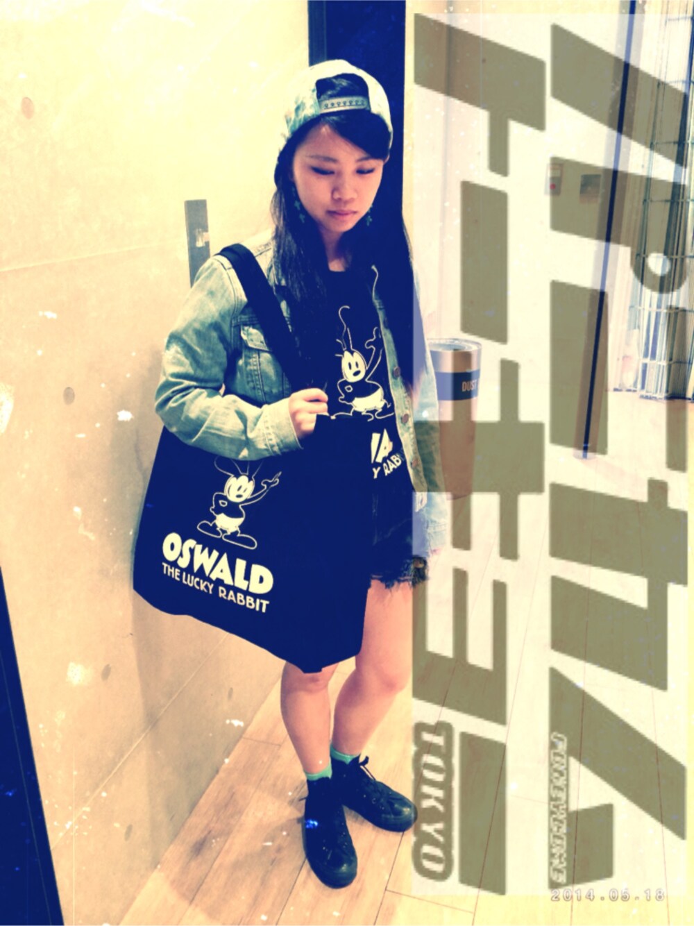 最高にツイてるウサギ、オズワルド ザ ラッキーラビットのTシャツ(M)を使ったコーディネート💙 Tシャツとお揃いでトートバッグもオズワルドにし、黒で統一したデニムと合わせたコーディネートです💙!