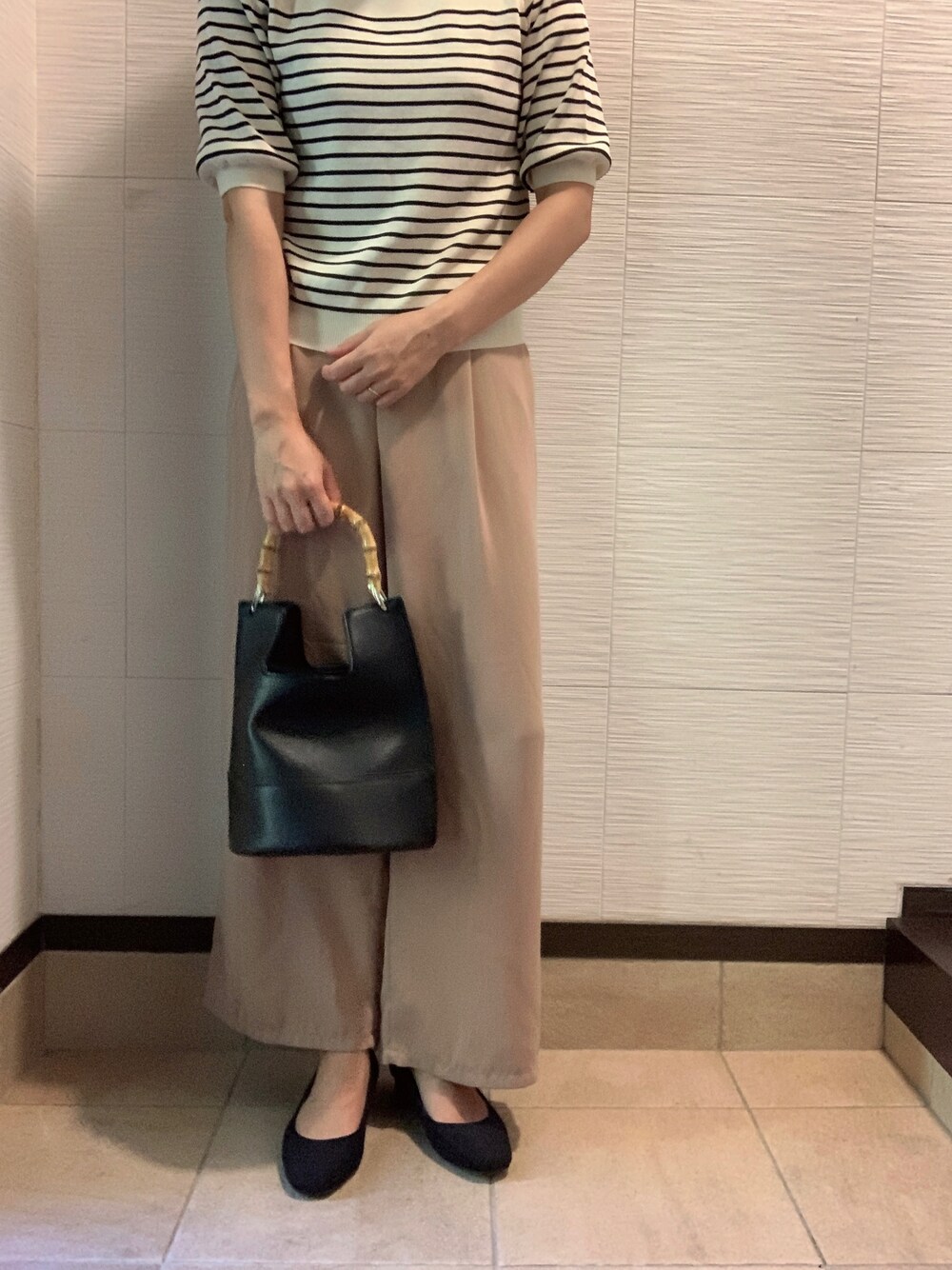 ボーダー×ベージュ 小物はブラックでバンブーがアクセント🎋