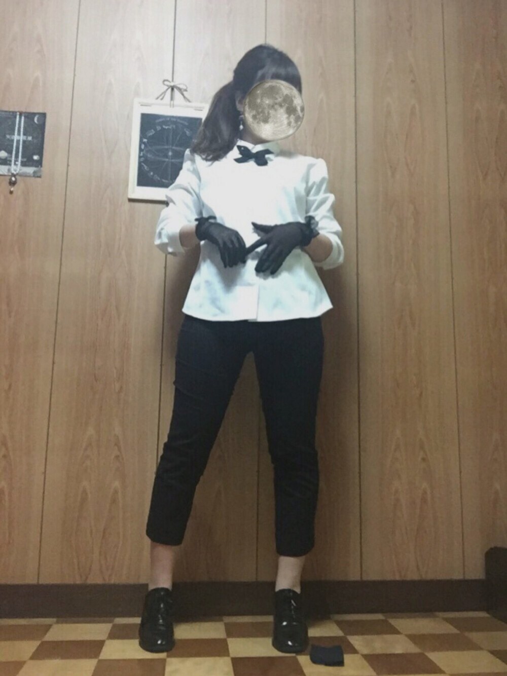 黒と白で纏めたパキッとしたコーデ👌🙆 胸のリボン、実は髪飾り❀✿ 黒のレース手袋つけると色気も出て大人っぽいね! 靴下ちゃんと履いてますよ🙋🙋 足元にハンカチが落ちてたままだった…!! PEGEBOYのオックスフォードシューズが万能すぎる。。 もう一足欲しい😌